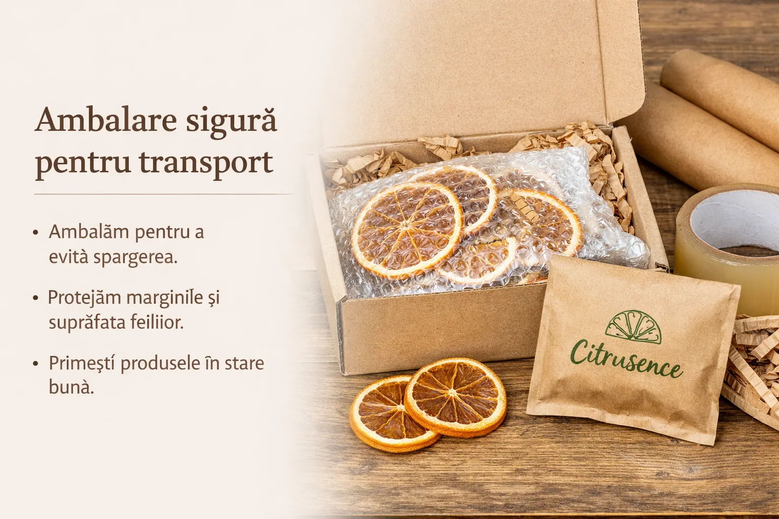 Feliile de citrice sunt ambalate in pungi cu Zip si vidate pentru o pastrare de pana la 3 luni a aromelor si savorilor