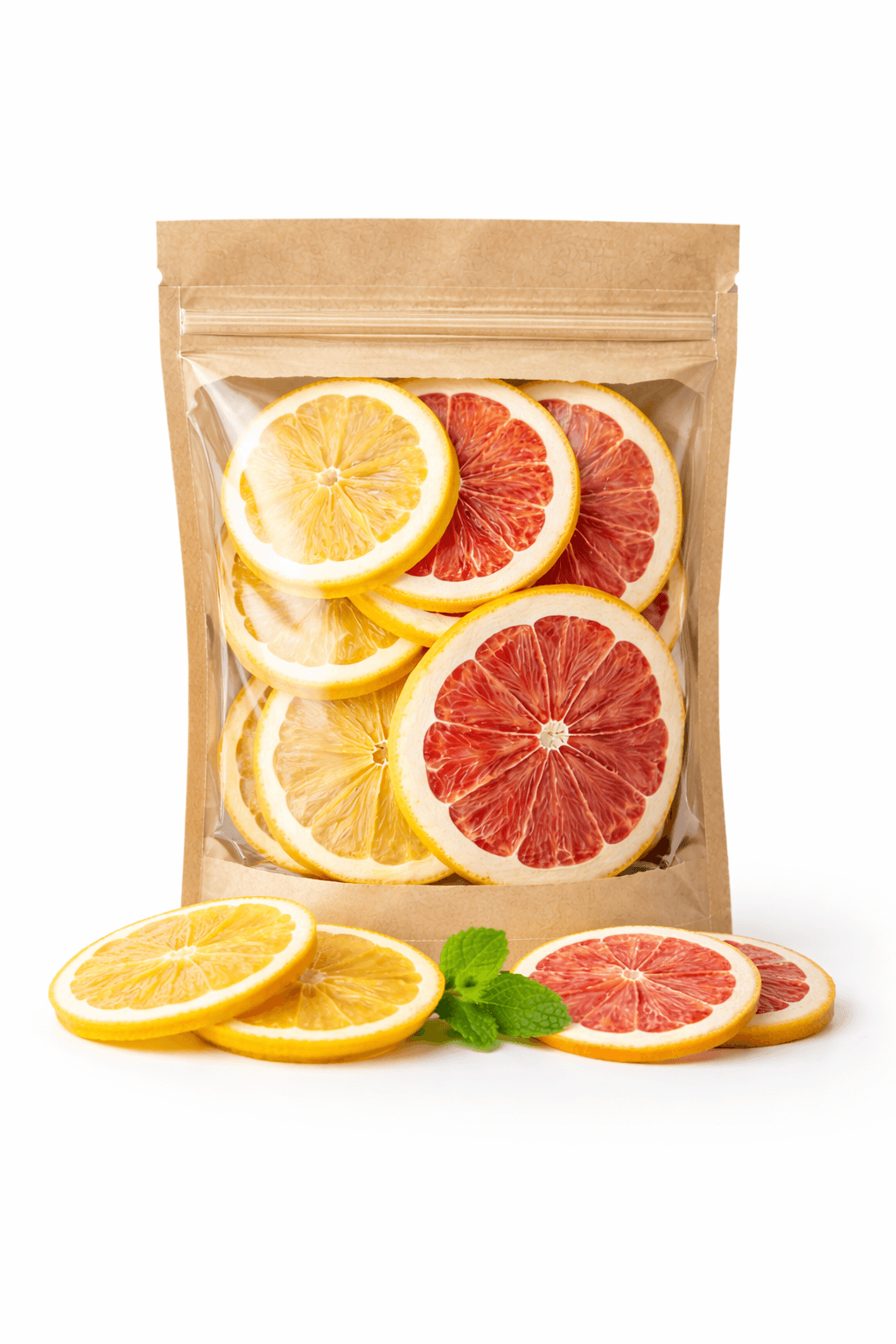 Lemon slices provide clarity, brightness and a refined appearance, while grapefruit slices add depth, texture and a slightly larger visual scale. Each citrus type is sliced uniformly and slowly dehydrated through a controlled process that preserves structure, surface detail and color definition.