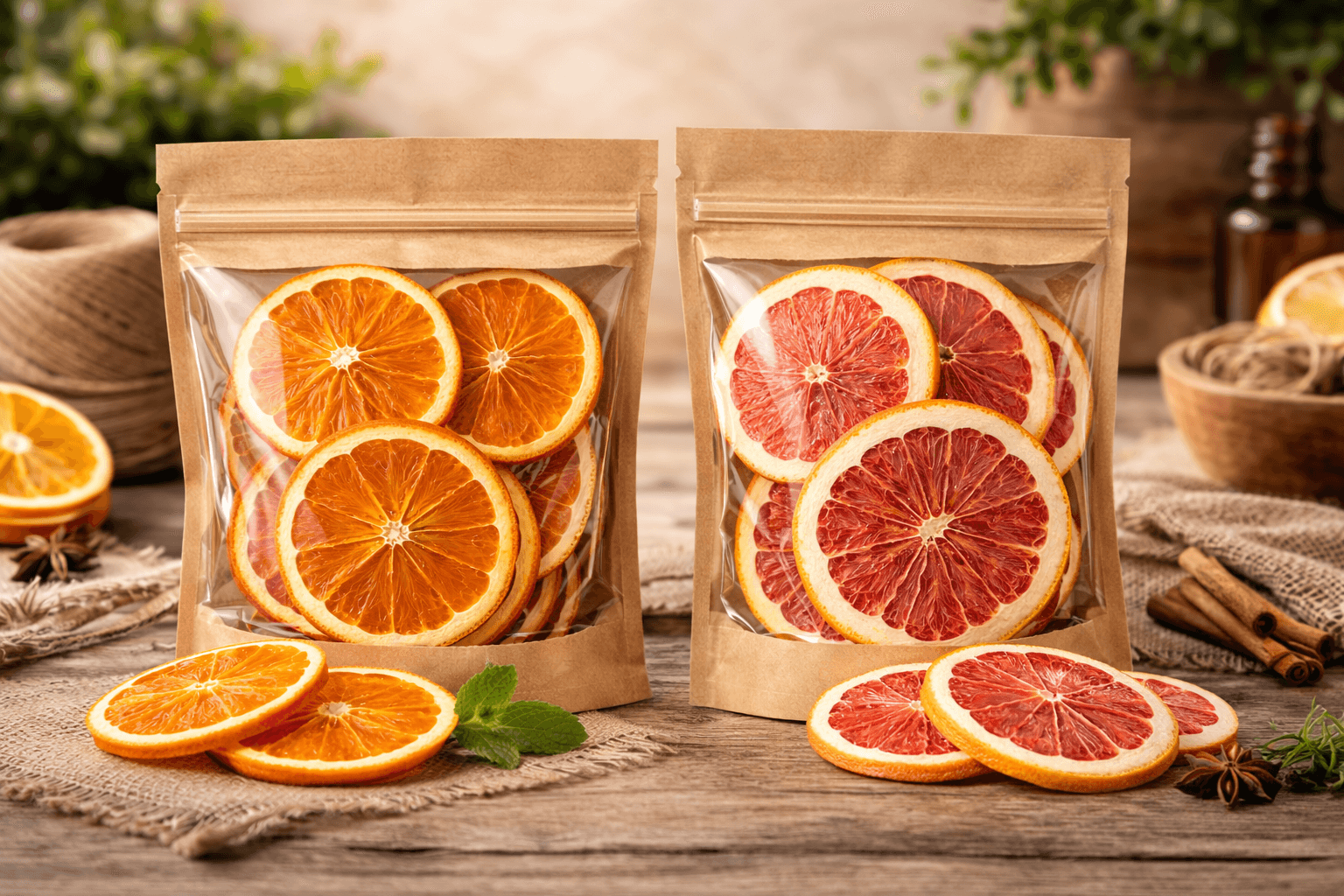 Setul Citrusence Decor Contrast Citrice combină felii de portocală și grapefruit deshidratate, ambalate în două porții separate de câte 100 g, oferind un contrast vizual puternic prin culoare, dimensiune și textură. Acest set este destinat utilizărilor creative, estetice și vizuale în decor interior, evenimente și proiecte handmade.