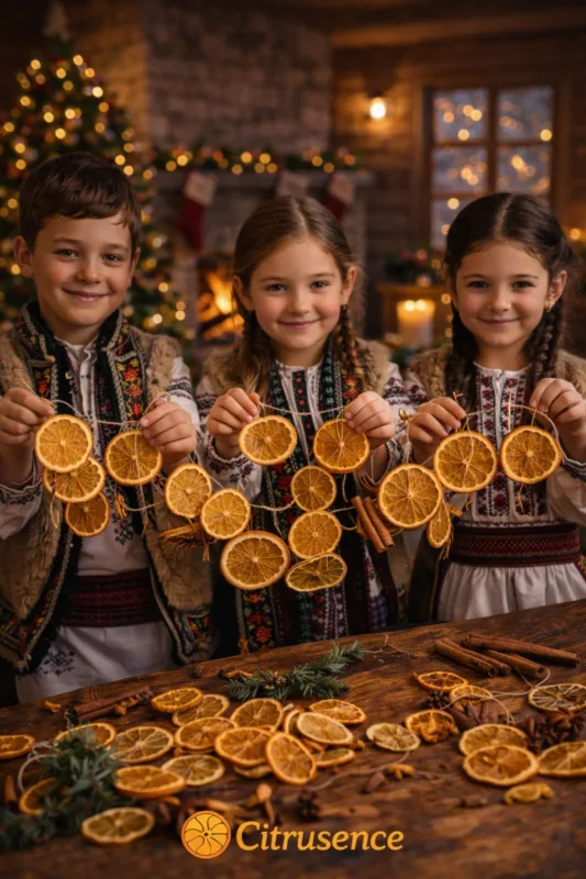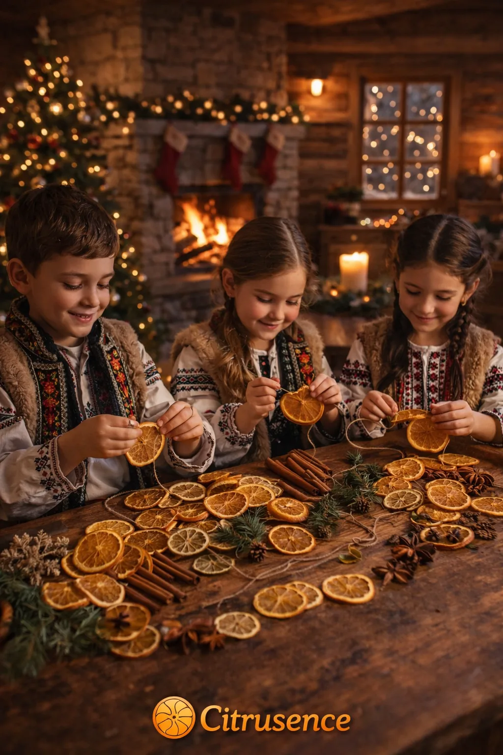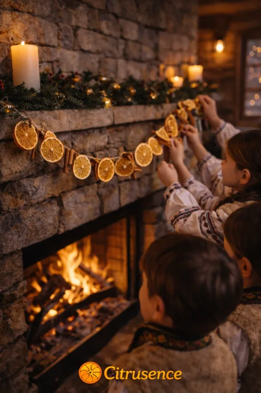 Când ghirlanda e gata, copiii se ridică. O duc la șemineu. O așază cu grijă. Portocala se aprinde în lumină. Scorțișoara completează. Lemnul din jur le ține loc de ramă.
